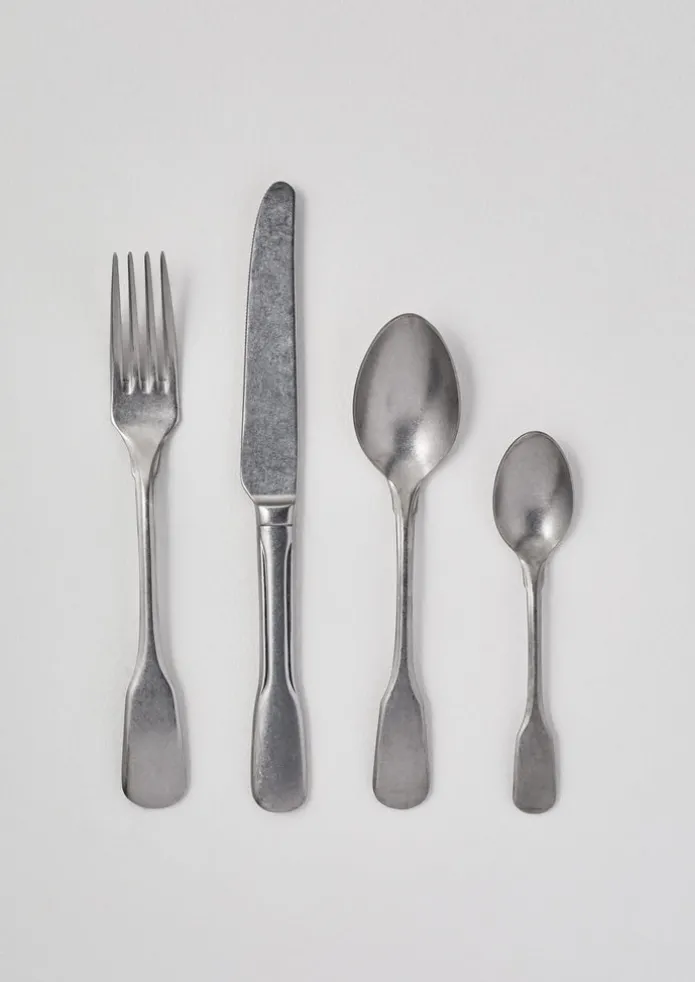 Good quality, weighty and classic design. Stainless steel with a stone washed finish. The set includes a knife, fork, dessert spoon and teaspoon. Each set comes in a cotton drawstring bag. Made in Italy. Details Dishwasher safe. Stainless steel. Made in Italy. Fork L 21cm. Knife L 24cm. Dessert Spoon L 18.8cm. Teaspoon L 14.5cm.