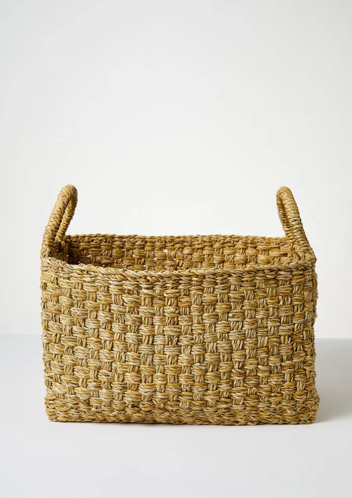 Large storage basket handwoven by female artisans supported by Fair Trade organisations across Bangladesh. Maison Bengal utilises locally grown natural materials and develops renowned traditional skills. Crafted to a capacious shape from hogla grass and finished with a sturdy handle at each side, for use as a log basket or as you will. Details Brush clean. Hogla sea grass.Made in Bangladesh.L 45cm x W 30cm x H 25cm.