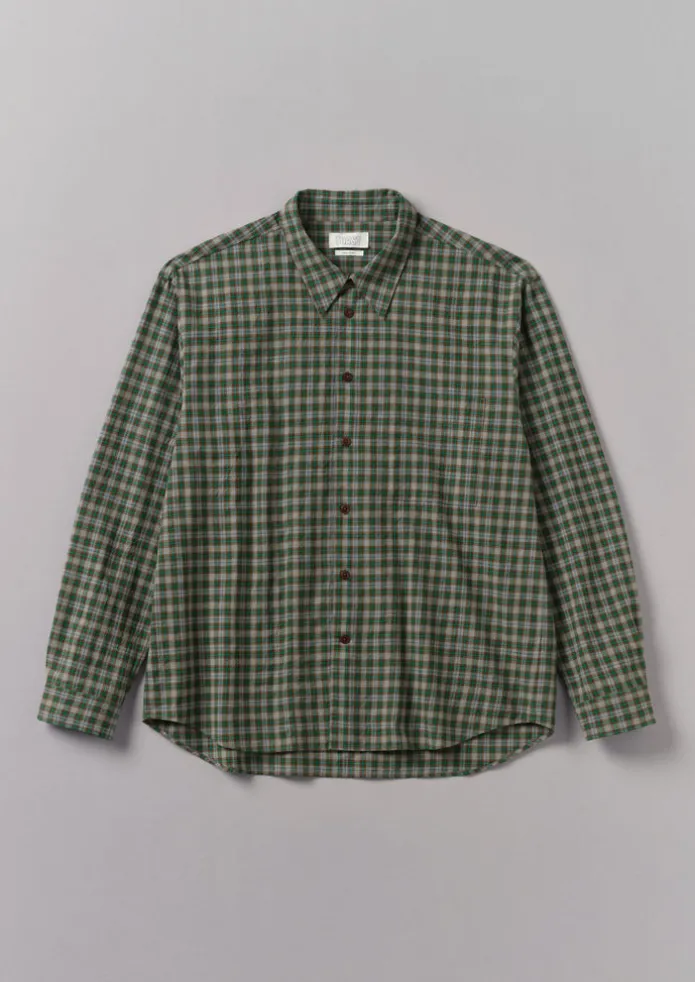 Our shirt is crafted from a wool blend containing cotton, which is woven with a check pattern. Cut to sit off the shoulder with a curved hem for an easy fit, then finished with a back hanger loop. Part of our Menswear collection. Wool and cotton blend. Point collar. Forward-sitting shoulders. Chest patch pocket. Back yoke panel. Back hanger loop. Details Machine wash 30ºC. 77% cotton, 23% wool. Made in India. Size & Fit Oversized. Length: Low hip. Sleeve: Full length. Neck: Polo neck. Studio model Lohit is 6ft 2in/189cm tall and is wearing a size M.