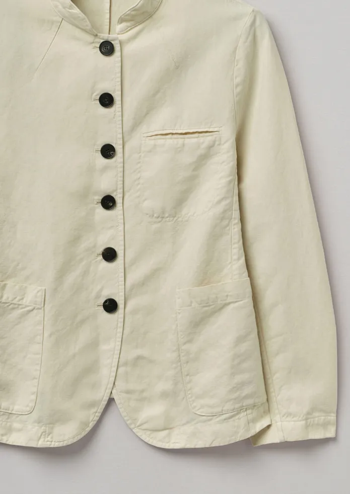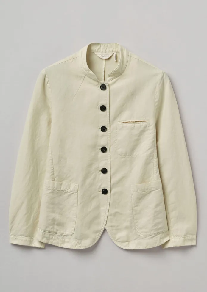A jet pocket punctuates the chest of our pared-back jacket. Crafted from cotton and linen woven in Italy to a neat shape with a band collar and curved hem, then finished with an internal hanging loop. The jacket is garment-dyed, a process that gives each piece a washed, crumpled texture and natural colour variations. Cotton and linen blend. Garment-dyed. Band collar. Central back seam. Wristbone-length sleeves. Chest jet pocket. Side patch pockets. Curved hem. Internal hanging loop. Horn buttons. Details Machine wash 30ºC gentle cycle. 51% linen, 49% cotton.Made in Romania. Size & Fit Regular fit. Length: Low hip. Sleeves: Wristbone length.Studio model Sara is 5ft 7in/174cm tall and is wearing a size 8.