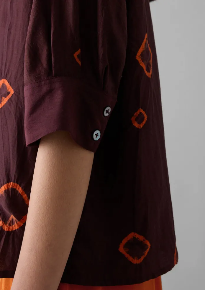 Our silk shirt is patterned by hand in India using the bandhini technique, making each unique. The fabric is tied and knotted with yarn before dyeing, a resist-dyeing method which traces back thousands of years. Shaped with a point collar and accented by lustrous mother-of-pearl buttons. Bandhini-dyed silk. Point collar. Back gathers. Elbow-length sleeves. Gathered buttoned cuffs. Side hem slits. Low-hip length. Mother-of-pearl buttons. Details Dry clean only. 100% silk. Made in India.Silk yarns are very delicate. Please protect the item from sharp objects or jewellery that may catch or snag, and avoid any drops or splashes of liquid as they may leave marks. Size & Fit Regular fit. Length: Low hip. Sleeve: 3/4 length. Studio model Nova is 5ft 9in/175cm tall and is wearing a size 8.