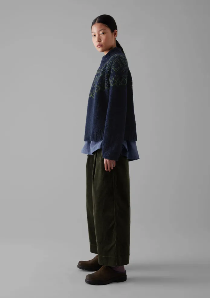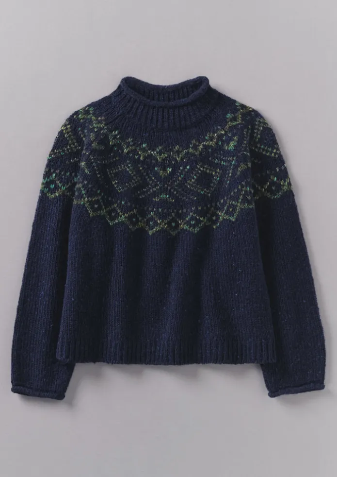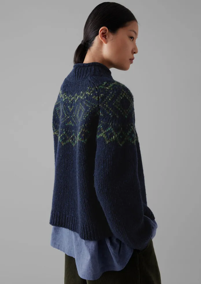 Colourful specks are scattered through our sweater, which is crafted from a mix of wool spun in Donegal, Ireland, and jacquard wool in a geometric pattern. Knitted to an easy, slightly swingy shape with raglan sleeves, finished with a roll at the high neck. Donegal-spun wool. Geometric jacquard yoke. Easy shape. Roll-edged high neck. Shaped yoke. Raglan sleeves. Mid-hip length. Ribbed edges. Details Hand wash. 100% wool. Made in Romania.Soft yarns are liable to pill to some extent, even when using those of the best quality. To take good care of them remove any pills using a pilling comb and protect them from sharp items or jewellery that may catch or snag. Size & Fit Easy fit. Length: Mid hip. Sleeve: Full length. Neck: High neck. Studio model Haley is 5ft 9in/175cm tall and is wearing a size S.