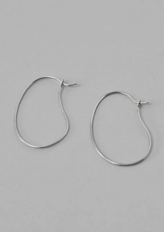 Organic-shaped hoops crafted by Spanish jeweller Helena Rohner. The sterling silver is flattened and shaped to a simple medium hoop, finished with a subtle clasp closure. Details 925 sterling silver. Silver oxidises naturally. You can clean and polish silver pieces using jewellery cloths to keep them looking their best. It is important not to use chemical products which may stain the metal.Made in Spain.35mm x 20mm, 1mm width.