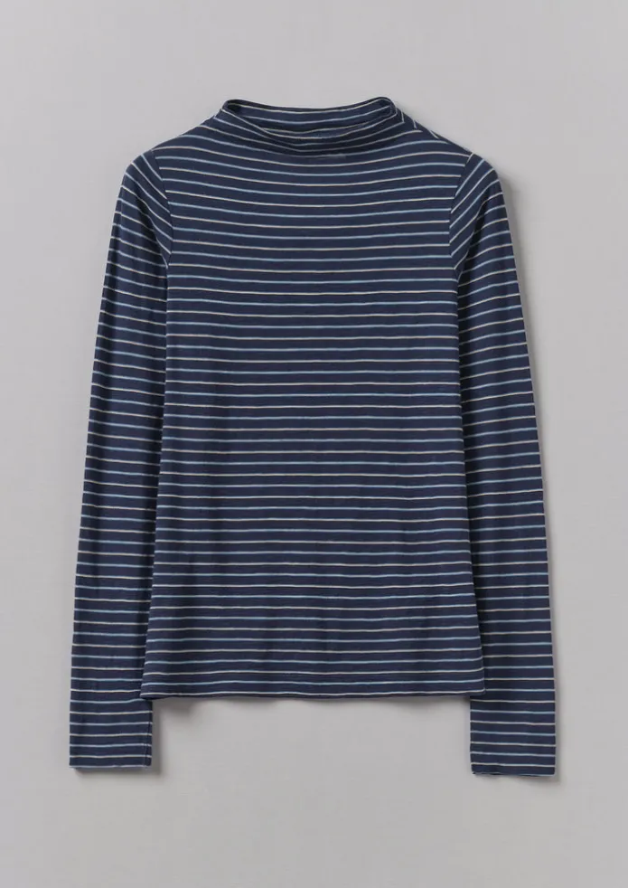Our tee is crafted from lightweight jersey which has a slub for a slight texture and finished with a stripe. Cut with a high neck and to a neat silhouette for effortless layering, with elongated sleeves. Organic cotton jersey. High neck. Elongated sleeves. Low-hip length. Details Machine wash 40ºC. 100% cotton. Made in Portugal.These cotton fibres have been grown in a chemical and pesticide free environment. Size & Fit Regular fit. Length: Low hip. Sleeve: Full length. Neck: High neck. Studio model Nova is 5ft 9in/175cm tall and is wearing a size 8.