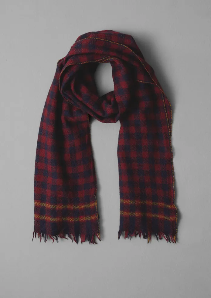 Soft wool scarf from French label Moismont, based in Picardy, which supports artisans in India. Woven into a checked pattern on traditional handlooms and finished with fringed ends. Each scarf is slightly unique. Handwoven wool. Fringed ends. Check pattern. Details 85% wool, 15% silk. Wash by hand in cold water, leave to air dry.Made in India.178cm long, 52cm wide.