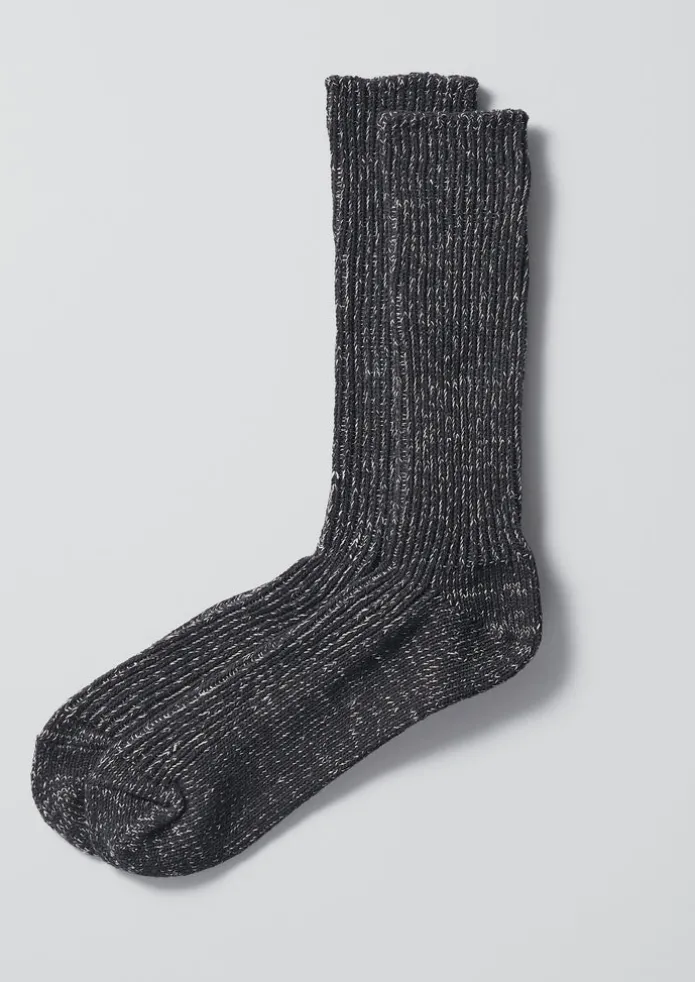 Marled, breathable cotton and hemp-blend socks crafted by Nishiguchi Kutsushita, a Japanese sock company established in 1950. Made in a small workshop using old knitting machines and shaped with defined ribbing. Details 77% cotton, true hemp 18%, polyester 4%, elastane 1%. 30 degree gentle machine wash. Made in Japan. 23-25cm.
