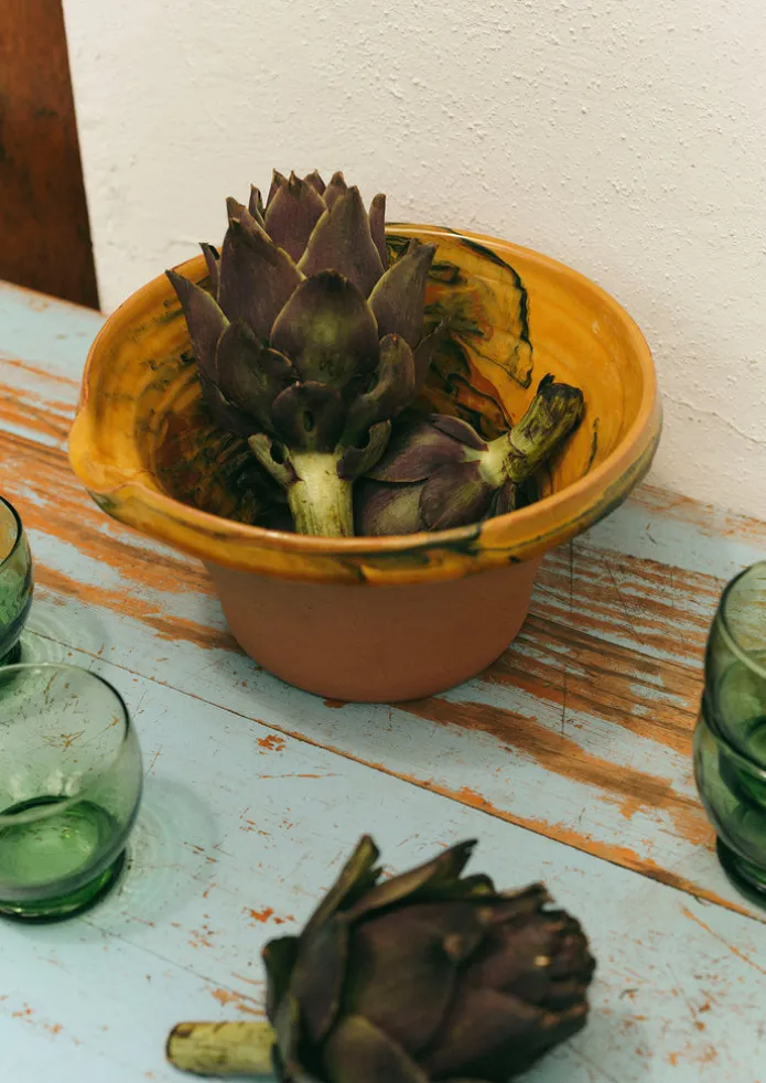 Pouring bowl handmade in Aubagne, southern France by artisans at Poterie Barbotine. Hand-thrown from earthenware with a lipped rim, then finished with a marbled slip pattern that varies from piece to piece. Details Earthenware. Dishwasher and microwave safe.Made in France.Approx. D20cm.
