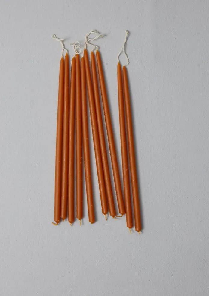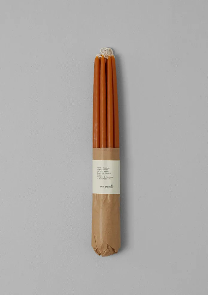 Five pairs of slim dinner candles from Skar Organics, hand-poured in Leeds from organic beeswax with an unbleached organic cotton wick. To help prevent contamination of the beeswax, the apiaries are sited within a 3km radius that is free of significant sources of pesticides, waste sites and major roads. With natural variations in colour and a burn time of 30 hours per bundle. Details 100% pure organic beeswax, organic cotton wick. Do not burn in direct sunlight or near any source of heat. Never leave a burning candle unattended. Burn out the reach of children and pets. Trim the wick between burns to 10mm. Remove any debris that may collect in the wax pool around the wick once it is safe to do so. Do not allow the candle to burn all the way down, and extinguish before it burns in the holder. Burn time per bundle 30+ hours.Made in the United Kingdom.Approx. 27cm x 1cm per candle. Total weight 175g. Burn time 30+ hours per bundle of 10.