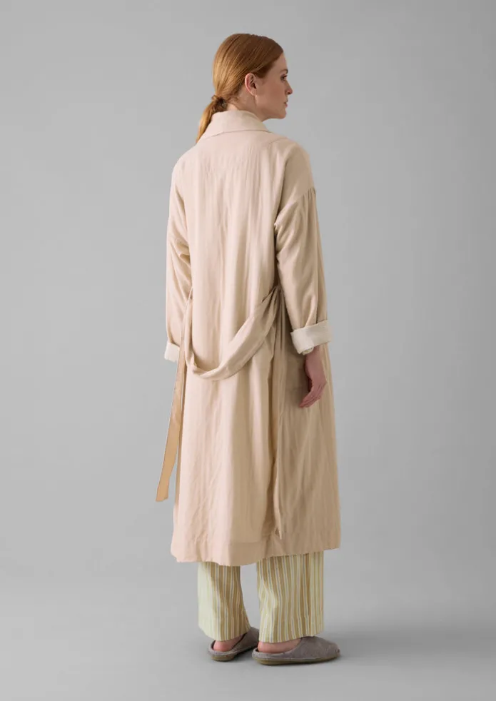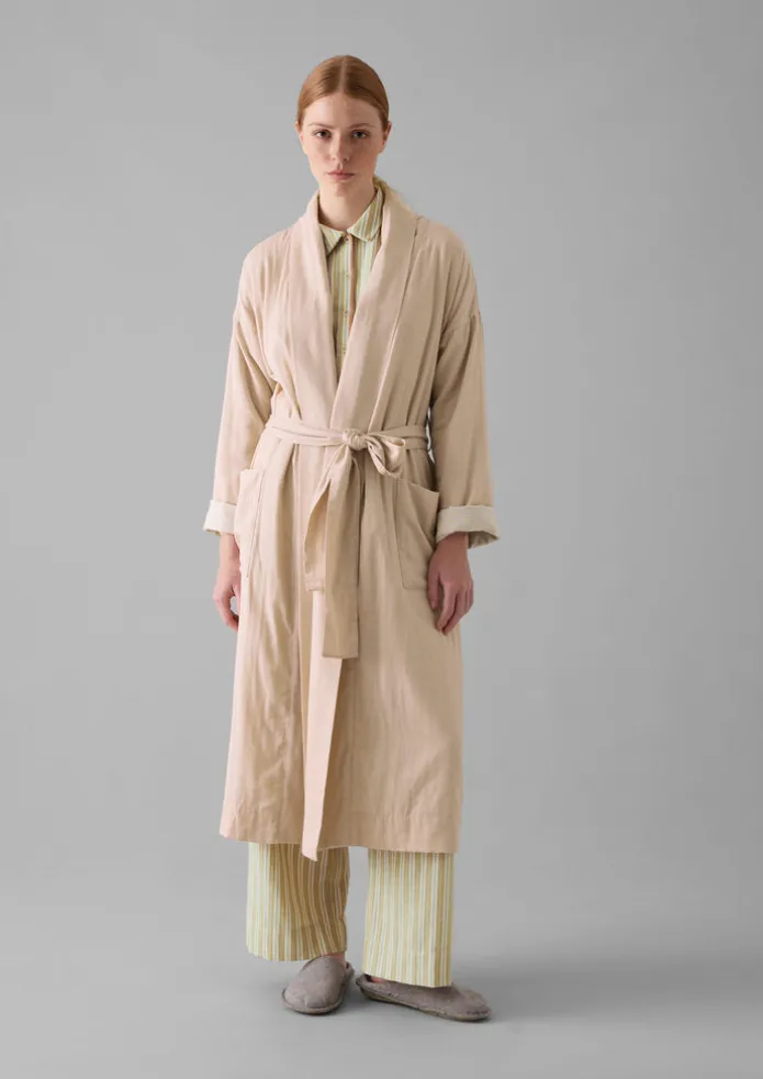Our gown is made from double-faced cotton with a striped cotton interior that can be revealed with rolled-up sleeves. Cut to an easy shape which is cinched in by the waist tie, with a shawl collar, then finished with side pockets. Soft double-faced cotton. Striped cotton interior. Easy shape. Waist tie. Side pockets. Internal hanging loop. Details Machine wash 30ºC gentle cycle. 100% cotton. Made in India. Size & Fit Easy fit. Length: Mid calf. Sleeve: Bracelet length. Studio model Haley is 5ft 9in/175cm tall and is wearing a size S.