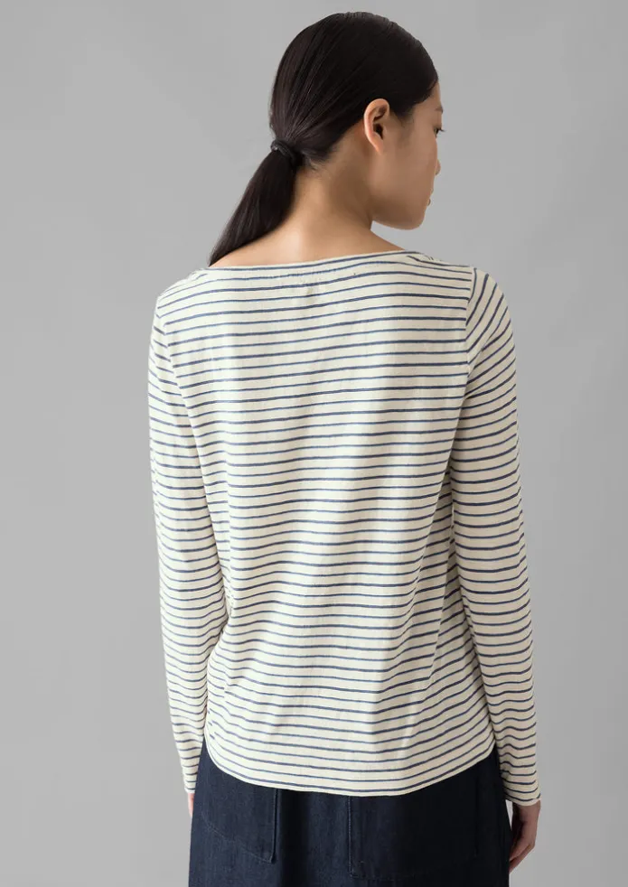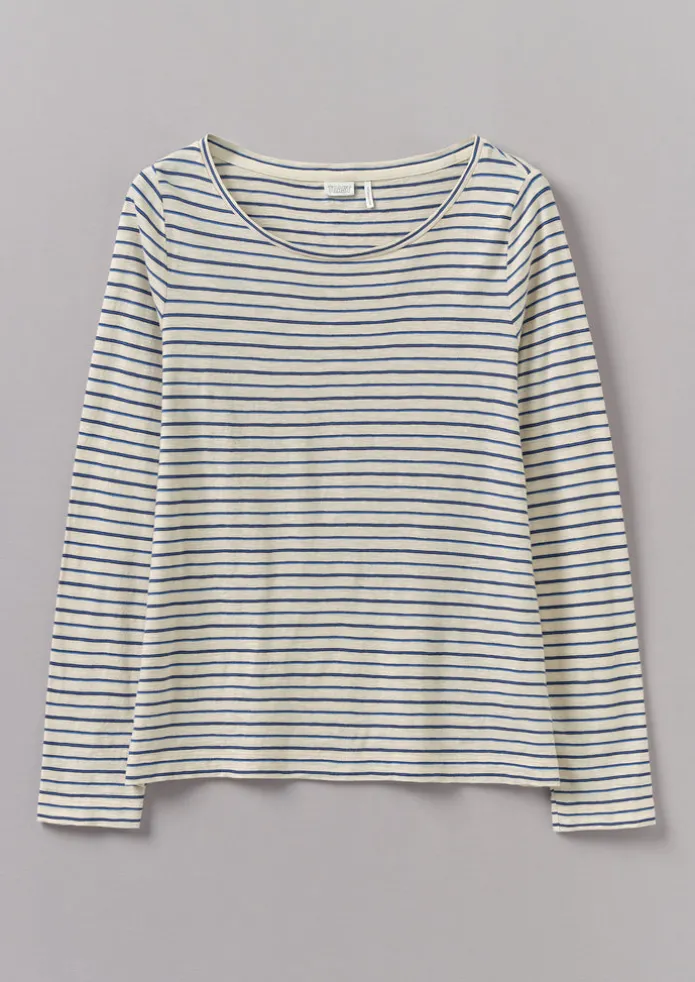 Soft, slubby cotton jersey brings an effortlessness to our tee. Shaped with an open boatneck and set-in sleeves, then finished with twin-needle-stitched edges. Striped slubbed cotton jersey. Single-stitched almond-shaped neck. Set-in sleeves. Top-hip length. Details Machine wash 30ºC gentle cycle. 100% cotton. Made in Portugal.These cotton fibres have been grown in a chemical and pesticide free environment. Size & Fit Regular fit. Length: Top hip. Sleeve: Full length. Neck: Boat neck.Studio model Nova is 5ft 9in/175cm tall and is wearing a size S.