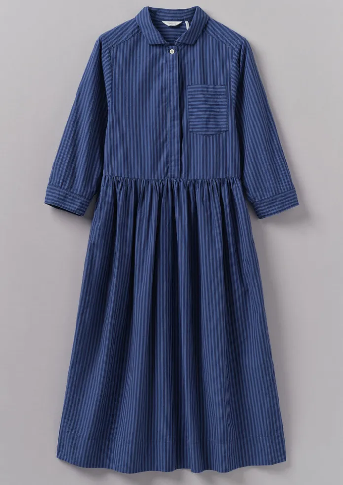 Slender stripes run down our shirt dress which is cut to an easy fit with a neat collar. Crafted from an organic crinkle cotton poplin, then garment dyed for a rich depth of colour. Organic crinkle cotton poplin. Collar. Side seam and patch pockets. Lower-calf length. Corozo buttons. Details Machine wash 30ºC. 100% cotton. Made in China.These cotton fibres have been grown in a chemical and pesticide free environment. Size & Fit Regular fit. Length: Lower calf. Sleeve: 3/4 length. Studio model Nova is 5ft 9in/175cm tall and is wearing a size 8.
