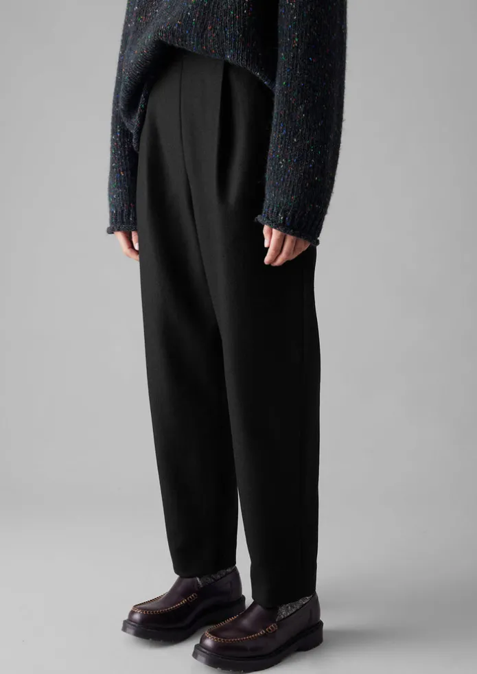 Our trousers are shaped with pleats at the front, bringing subtle volume to the legs, finishing at an ankle-skimming length. Crafted from wool flannel woven in Italy with a natural stretch for ease of movement. Italian woven wool. Pleated front. Slated front pockets. Waisted back darts. Welt pockets. Details Dry clean only. Main Fabric: 100% wool. Lining: 100% cotton. Made in Romania. Size & Fit Regular fit. Length: Ankle skimming. Waist: On the waist. Studio model Maggie is 5ft 8in/172cm tall and is wearing a size 8.